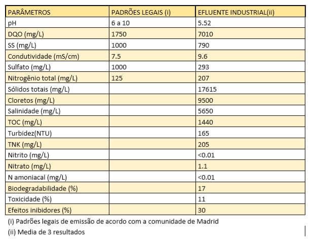A tabela mostra a caracterização dos efluentes desta indústria e os limites de descarga no sistema de esgotos sanitários de acordo com a legislação regional- comunidade de Madrid (Grau 57/2005).